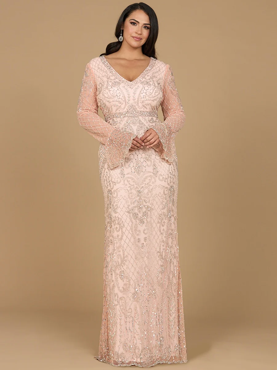 Long Bell Sleeve V-Neck Beaded Gown