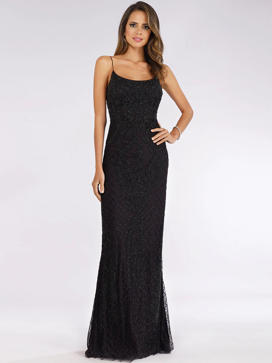 Fitted straight neck long gown covered in seed beads featuring a large open back with lace up pattern. Features a unique scoop neckline that's flattering for any girl. Available in Black and Periwinkle. Perfect for a special night out with loved ones!